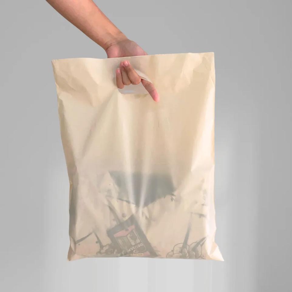 Bolsas de boutique biodegradables de plástico, en colores verde menta, rosa y melocotón.