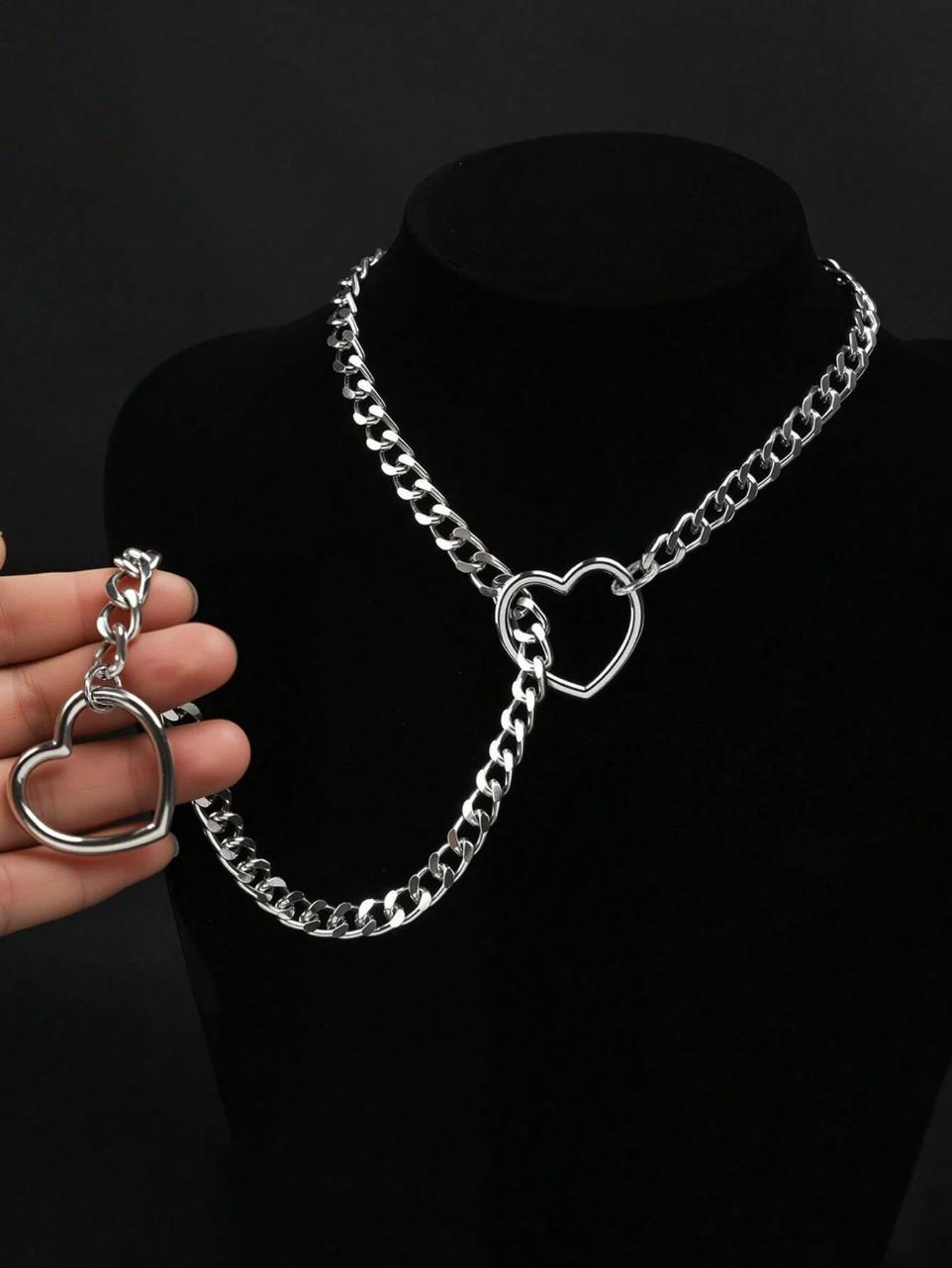 Diseño audaz y simbólico con una cadena plateada de acero inoxidable, culminando en detalles de corazones en los extremos.